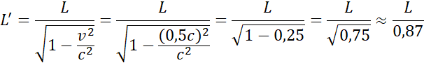 Wykorzystaj wzór opisujący zależność między długościami drogi mierzonymi w dwóch układach wyprowadzony na podstawie transformacji Lorentza. Dokonaj przekształcenia wzoru, wstaw dane liczbowe i wykonaj obliczenia.