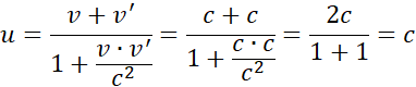 Wykorzystaj wzór relatywistyczny na składanie prędkości. Wstaw odpowiednie wartości prędkości, wiedząc, że fotony poruszają się z prędkością światła i wykonaj obliczenia.