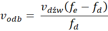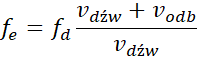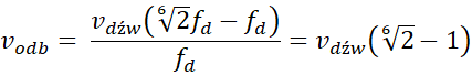 Wykorzystujemy wzór na efekt Dopplera. Częstotliwość dźwięku e1 jest wyższa o dwa tony od dźwięku d1, a więc razy większa.
