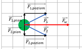 Możesz rozłożyć podane siły na składowe działające w pionie i poziomie, a następnie odpowiednio je ze sobą sumować w tych kierunkach. Jak możesz zaobserwować pionowe składowe obu działających sił są sobie równe, wobec czego siła wypadkowa działająca w pionie będzie wynosiła 0. Siły składowe poziome natomiast są skierowane w tą samą stronę i są sobie równe, wobec czego siła wypadkowa działających sił będzie ich sumą. Wektor siły wypadkowej będzie długi na 4 kratki, czyli ta siła ma wartość 4 · 10 N = 40 N.