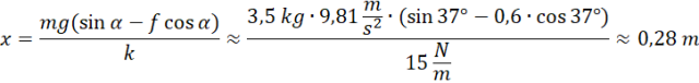 Wydłużenie to stosunek siły wypadkowej na kierunku działania sprężyny i współczynnika sprężystości. Obliczamy siłę wypadkową na kierunku równoległym do równi i podstawiamy odpowiednie wartości liczbowe.