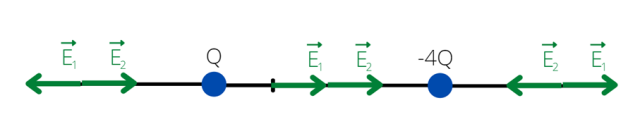 Punkt musi znajdować się poza linią łączącą ładunki. Z uwagi na to, że większą wartość bezwzględną ma ładunek 2, więc wytwarza mocniejsze pole, punkt, w którym natężenie pola wynosi 0, znajduje się po lewej stronie ładunków.