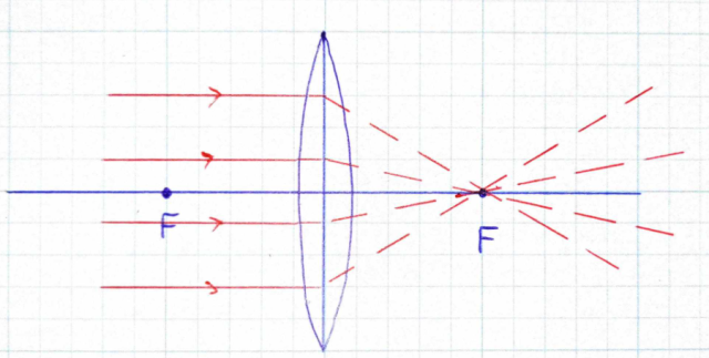 Bieg promieni przechodzi przez ognisko po drugiej stronie soczewki – skupia je.