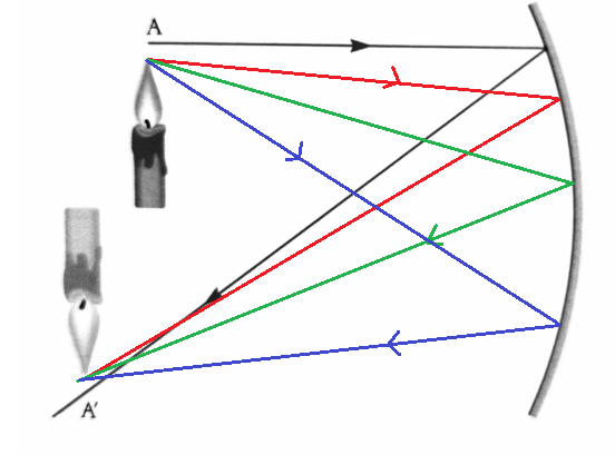 W tym zadaniu, różnymi kolorami, zaznacz promienie, które wychodzą z czubka płomienia, odbijają się od zwierciadła i docierają do obrazu czubka płomienia. Następnie zapisz cechy tego obrazu.