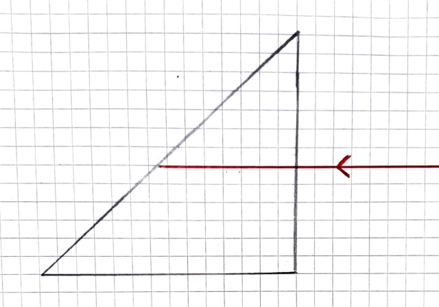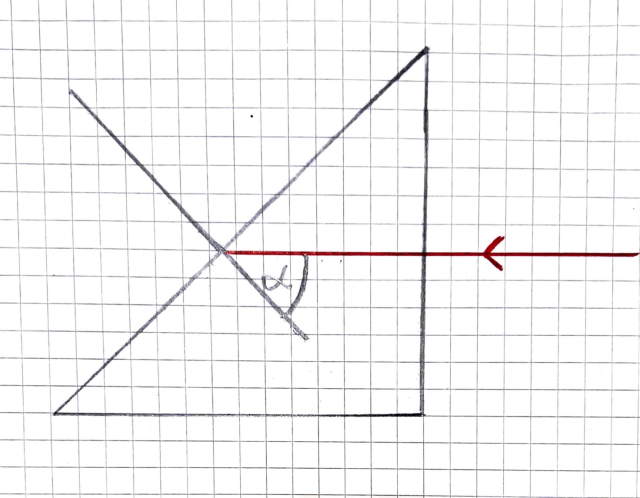 Promień pada prostopadle na granicę ośrodków powietrze-szkło. Dlatego nie odbije się. Będzie jednak przechodził do wnętrza pryzmatu. Następnie pada na granicę ośrodków szkło-powietrze pod kątem