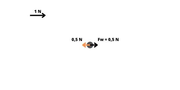 Na ciało działają siły o kierunku poziomym: o zwrocie w lewo i wartości 3 N, o zwrocie w prawo i wartościach 2,5 N oraz 1 N. Siła wypadkowa będzie miała kierunek poziomy, zwrot w prawo i wartość 1 N + 2,5 N – 3 N = 0,5 N. Siła ją równoważąca powinna mieć tę samą wartość i kierunek oraz przeciwny zwrot (na rysunku kolor pomarańczowy).