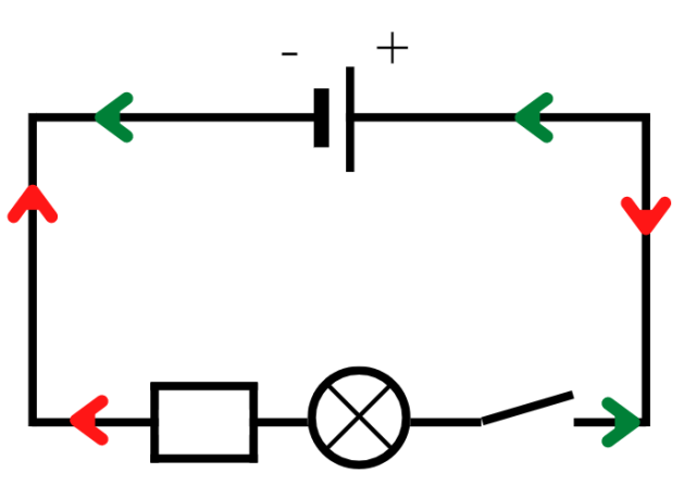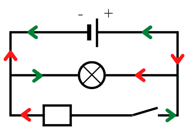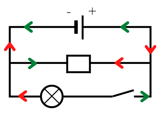 Kolorem czerwonym zaznaczono kierunek przepływu prądu, a zielonym kierunek przepływu elektronów.
