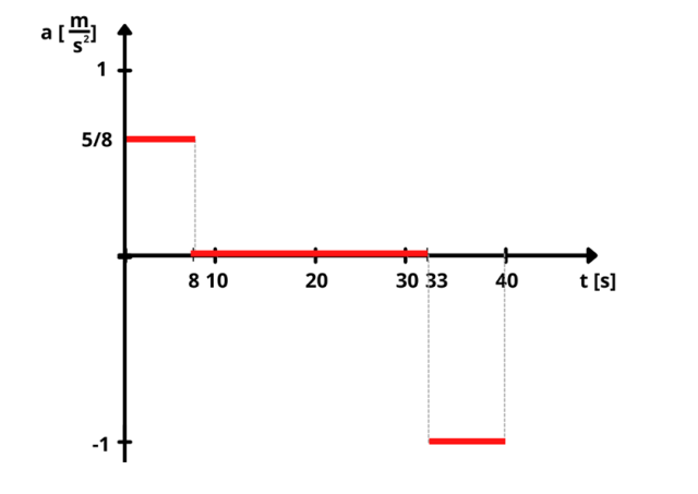 W pierwszej fazie autobus porusza się ruchem jednostajnie przyspieszonym. Nie znamy wartości przyspieszenia, dlatego oblicz ją, korzystając z odpowiedniego wzoru. Przyspieszenie w ruchu jednostajnym wynosi 0. Opóźnienie w trzeciej fazie ruchu interpretujemy jako ujemne przyspieszenie.