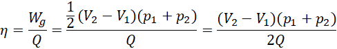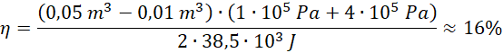 Stosujemy wzór na sprawność silnika. Pracę wykonaną przez gaz obliczamy za pomocą pola pod wykresem. Wartość ciepła pobranego wstawiamy korzystając z poprzedniego podpunktu.