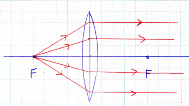 Promienie wychodzą z ogniska i po przejściu przez soczewkę – biegną równolegle do osi optycznej.