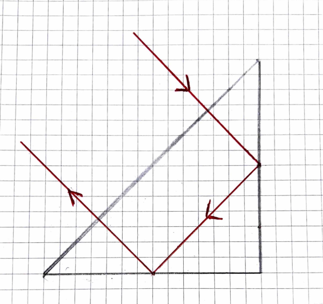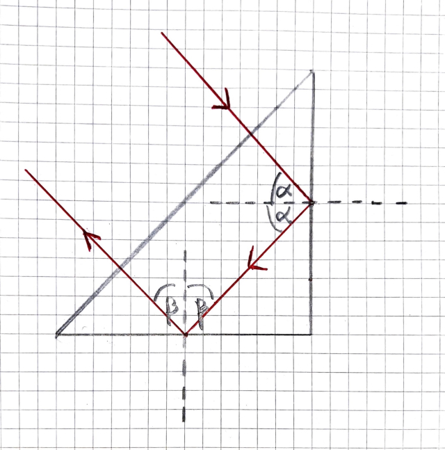 Ponieważ, zgodnie z zadaniem, chcesz otrzymać promień wychodzący z pryzmatu i będący równoległym do promienia padającego. Chcesz go zatem odbić o