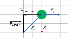Możesz rozłożyć podane siły na składowe działające w pionie i poziomie, a następnie odpowiednio je ze sobą sumować w tych kierunkach. Jak możesz zaobserwować poziome składowe obu działających sił są sobie równe, wobec czego siła wypadkowa działająca w poziomie będzie wynosiła 0. W pionie natomiast działa tylko jedna siła skierowana w dół, będzie ona siłą wypadkową. Wektor siły wypadkowej będzie długi na 2 kratki, czyli ta siła ma wartość 2 · 10 N = 20 N.