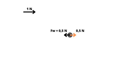 Na ciało działają siły o kierunku pionowym, zwrocie w górę o wartościach 1 N i 1 N oraz o zwrocie w dół i wartości 2 N. Ich wypadkowa ma wartość 2 N – 1 N – 1 N = 0 N. Na ciało działają również siły o kierunku poziomym: o zwrocie w lewo i wartości 2 N oraz o zwrocie w prawo i wartości 1,5 N. Ich wypadkowa ma wartość 2 N – 1,5 N = 0,5 N, kierunek poziomy i zwrot w lewo. Siła ją równoważąca powinna mieć tę samą wartość i kierunek oraz przeciwny zwrot (na rysunku kolor pomarańczowy).