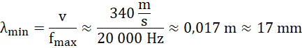 Z tablic odczytujemy zakres częstotliwości słyszalnej przez człowieka i prędkość fali dźwiękowej w powietrzu. Na tej podstawie obliczamy wartości krańcowe zakresu długości fali.