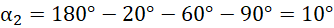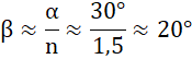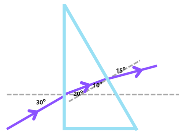 Obliczamy kąty załamania i kąt padania na drugą ściankę za pomocą wzoru łączącego kąty ze współczynnikiem załamania światła i właściwości kątów w trójkącie.