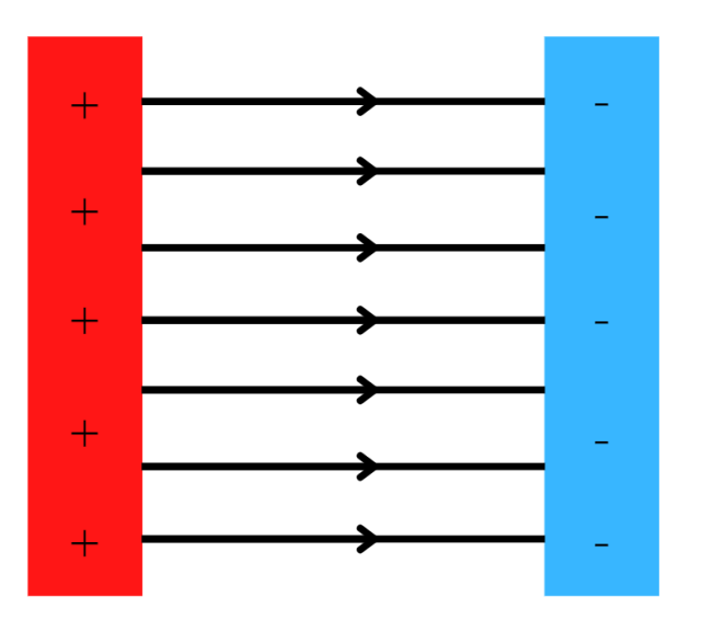 Linie pola są równoległe, skierowane od (+) do (-). Jest to pole jednorodne, więc linie mają jednakowe odstępy między sobą.
