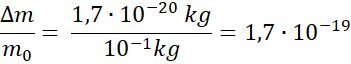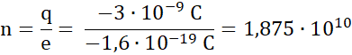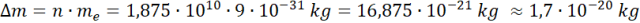 Obliczamy ilość elektronów, dzieląc cały ładunek przez ładunek elementarny (ładunek jednego elektronu). Następnie obliczamy masę wszystkich elektronów, mnożąc ilość elektronów razy masę jednego elektronu. Na koniec obliczamy stosunek przyrostu masy do masy początkowej.