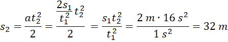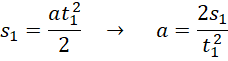 Korzystając z danych na temat ruchu w pierwszej sekundzie ruchu obliczamy przyspieszenie. Następnie, podstawiając wyznaczoną wartość przyspieszenia, obliczamy drogę w pierwszych czterech sekundach ruchu. W obu przypadkach korzystamy ze wzoru na drogę w ruchu jednostajnie przyspieszonym bez prędkości początkowej.