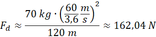 Na początku wypisujemy dane i zamieniamy jednostkę prędkości na jednostkę stosowaną w układzie SI. Nie zamieniamy wyniku do postaci dziesiętnej, aby uniknąć błędu przybliżenia. Następnie do wzoru na siłę dośrodkową podstawiamy odpowiednie wielkości i otrzymujemy wynik.