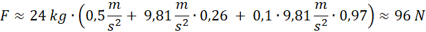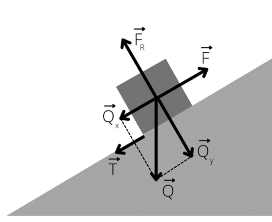 Na początku szkicujemy rysunek pomocniczy, zaznaczając na nim wszystkie siły działające na paczkę. Następnie zapisz II zasadę dynamiki Newtona na kierunku x równoległym do powierzchni równi. Aby zachować poprawność rozwiązania, musimy zrzutować ciężar paczki na kierunki x i y. Podstaw wzory literowe na poszczególne siły, przekształcając wzór do zależności na siłę napędową paczki.