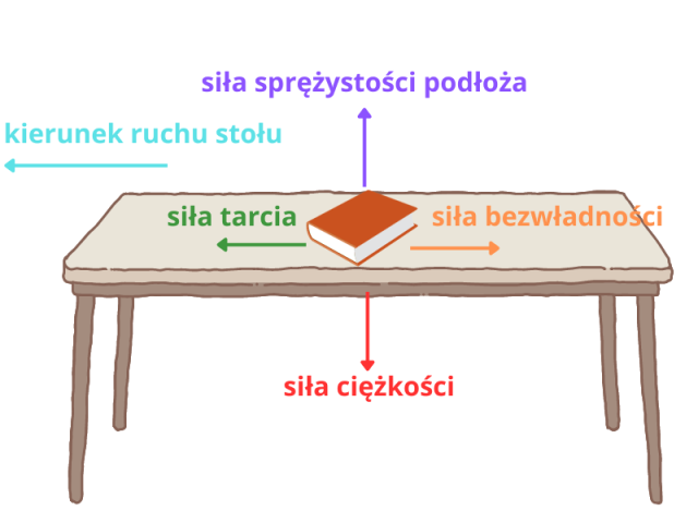Stół przyspiesza, na książkę działa więc siła bezwładności, której przeciwdziała siła tarcia.