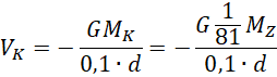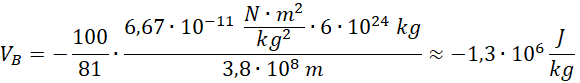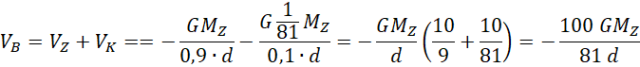 Obliczamy potencjał pola w punkcie B pochodzący od Ziemi i od Księżyca. Potencjał całkowity w punkcie B jest równy ich sumie.