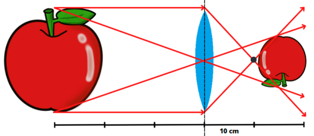 Obraz jest pomniejszony dwukrotnie. Jest od odległy od soczewki o