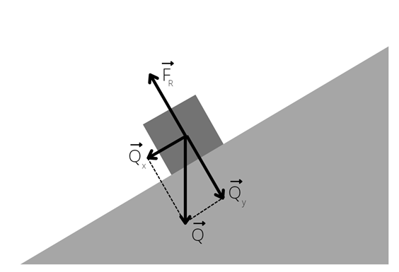 Wykonaj rysunek, na którym przedstawisz wszystkie siły działające na klocek zsuwający się bez tarcia z równi pochyłej, w układzie odniesienia związanym z klockiem.
