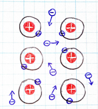 Na schemacie obok przedstawiono budowę wewnętrzną metalu, który jest przewodnikiem/izolatorem elektrycznym. Za pomocą strzałek zilustrowano chaotyczny ruch swobodnie poruszających się neutronów/elektronów/anionów. Gdy dotkniemy w dowolnym miejscu naładowanego przewodnika/izolatora zgromadzony na nim ładunek elektryczny zostanie natychmiast zobojętniony – odprowadzony (przez ludzkie ciało) do ziemi.