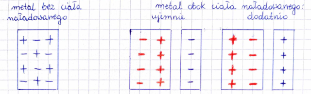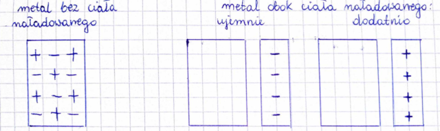 W tym zadaniu narysuj rozłożenie ładunków w metalu znajdującym się obok ciała naładowanego dodatnio i ujemnie.