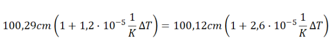 Podstawiamy dane do wzoru na długości prętów po ogrzaniu, mając ΔT jako niewiadomą. Następnie, wiedząc, że długość prętów ma być jednakowa, układamy równanie i obliczamy z niego przyrost temperatury. Następnie otrzymaną wartość dodajemy do początkowej temperatury.