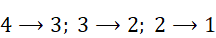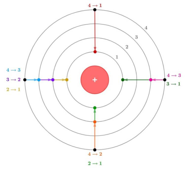 Rysunek przedstawia 4 możliwe przypadki powrotu elektronu z orbity czwartej na pierwszą. Liczba wyemitowanych fotonów jest równa liczbie przeskoków na drodze orbita 4-1.