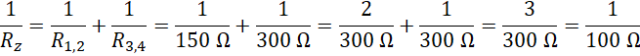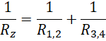 Układ oporników 1,2 i układ 3,4 są połączone równolegle, czyli odwrotność oporu zastępczego jest równa sumie odwrotności każdego z układów.