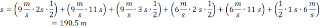 Pokonaną drogę możemy obliczyć jako pole pod wykresem funkcji prędkości od czasu, wówczas: