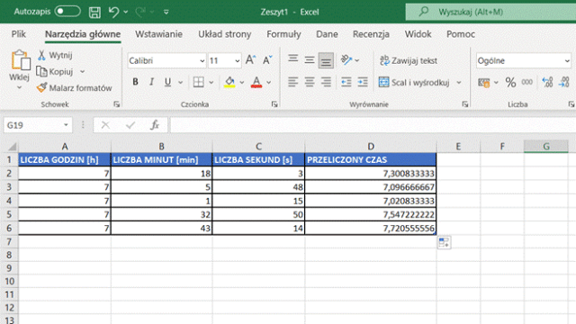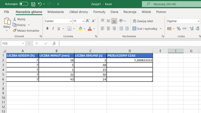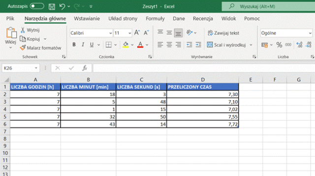 Tworzymy w nim tabelę przedstawiającą czas podany w pierwszej kolumnie tabeli z zadania. W naszej tabeli każda z kolumn odpowiada ilości godzin, minut oraz sekund.