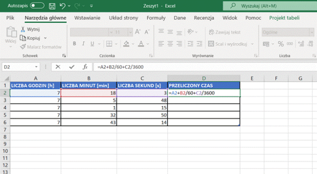 Dodatkowo dzielimy ją przez 60, czyli wpisujemy „/60” (dokonując zamiany jednostek z minut na godziny, należy wartość podzielić przez 60, bo 1 h = 60 min), następnie wpisujemy znak „+”, klikając na komórkę C2 i dzielimy ją przez 3 600 (dokonując zamiany jednostek z sekund na godziny, dzielimy wartość przez 3 600, bo 1 h = 3 600 s).