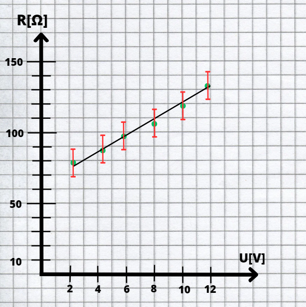 Funkcja jest jedynie w przybliżeniu funkcją liniową – niektóre wartości nieznacznie odbiegają od narysowanej prostej. Zauważ, że niepewność 10 Ω oznacza, że mogliśmy pomylić się zarówno 10 Ω w górę, jak i w dół.