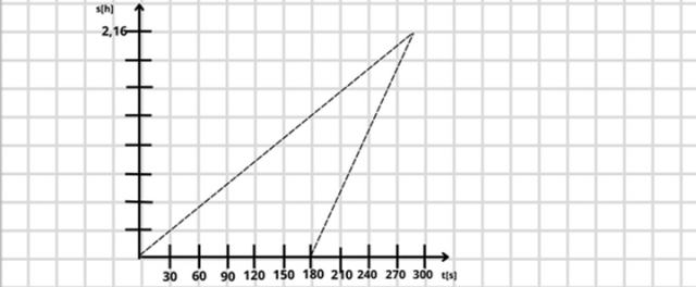 Goniec wyrusza później niż wóz, więc czas, w jakim pokona drogę do momentu spotkania, jest krótszy o trzy minuty. Oba pojazdy muszą pokonać tę samą drogę, iloczyn prędkości i czasu musi być więc taki sam dla obu pojazdów. Na tej podstawie oblicz czas, po którym nastąpi spotkanie. Zwróć uwagę, że pytanie dotyczy czasu, po jakim goniec spotka ciężarówkę. Następnie oblicz drogę jako iloczyn prędkości i czasu. Oba ruchy narysuj na wykresie s(t), na osi pionowej umieszczając drogę pokonaną przez pojazdy, a na poziomie czas, w jakim ją przebyły. Wykres motocykla zaczyna się o 3 minuty później niż wozu.