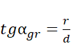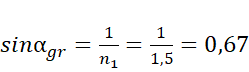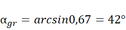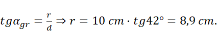 Oblicz sinus kąta granicznego. Jest to maksymalny kąt, pod jakim może rozchodzić się światło ze źródła punktowego, by światło mogło przejść do drugiego ośrodka, a nie całkowicie się wewnętrznie odbiło. Zatem promień kręgu świetlnego, a w konsekwencji promie zasłony, będzie związany z tym kątem i grubością szkła zależnością tangencjalną: