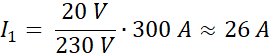 W tym zadaniu oblicz natężenie prądu uzwojenia pierwotnego o napięciu 230 V, jeśli na wyjściu uzwojenia wtórnego płynie prąd o natężeniu 300 A pod napięciem 20 V.
