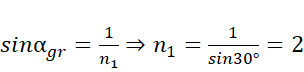 Wyznacz normalną do przeciwprostokątnej pryzmatu. Jest to linia prostopadła do powierzchni. Kąt padania wynosi tyle samo, ile mniejszy kąt w pryzmacie (30°). Rysunek wskazuje, że dla tego kąta nastąpiło całkowite wewnętrzne odbicie, zatem jest to kąt graniczny. Wykorzystując sinus tego kąta, oblicz współczynnik załamania.