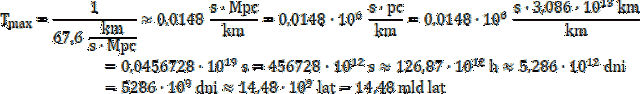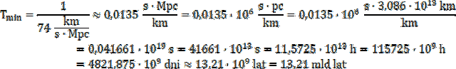 jest równa odwrotności stałej Hubble’a. Podstaw graniczne wartości tej stałej, aby uzyskać minimalny i maksymalny wiek Wszechświata.