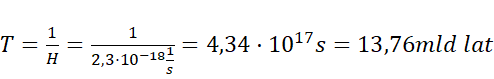 Oblicz odwrotność stałej Hubble’a, aby otrzymać czas w sekundach. Jest to wiek wszechświata. Zamień jego wartość na lata.