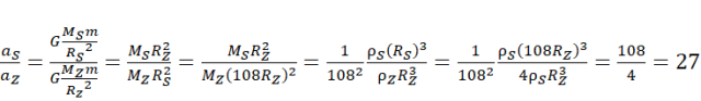 Zapisz równanie opisujące równość siły grawitacji w polu centralnym i jednorodnym. Zapisz stosunek przyspieszeń. Znając relacje promieni i gęstości, dzięki którym można obliczyć masy (wszystkie stałe fizyczne się skracają podczas obliczania stosunków), oblicz wartość tego stosunku.