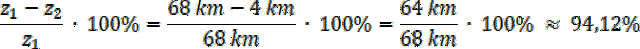 Aby obliczyć, o jaki procent zmniejszył się zasięg strzału, należy policzyć różnicę między dwoma zasięgami, a następnie podzielić ją przez dłuższy zasięg (to względem niego porównujemy zmianę).