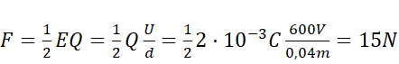 Oblicz natężenie jako iloraz napięcia między okładkami i odległości między nimi. Podstaw wartości do wzoru i oblicz wartość siły.