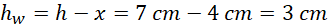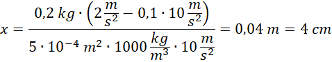 Zapisujemy II zasadę dynamiki dla odważnika. Korzystamy ze wzorów na siłę wyporu oraz ciężkości i, przekształcając otrzymaną zależność, obliczamy wysokość części zanurzonej w wodzie. Na koniec obliczamy wysokość części wystającej ponad wodę poprzez odjęcie wysokości zanurzonej od całkowitej wysokości odważnika.