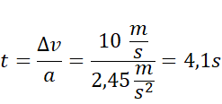 Siła tarcia powoduje opóźnienie tramwaju ‘a’. W równaniu dynamicznym ruchu masa się skróci, uzależniając opóźnienie jedynie od współczynnika tarcia i przyspieszenia grawitacyjnego. Oblicz czas z równania na prędkość w ruchu jednostajnie opóźnionym.