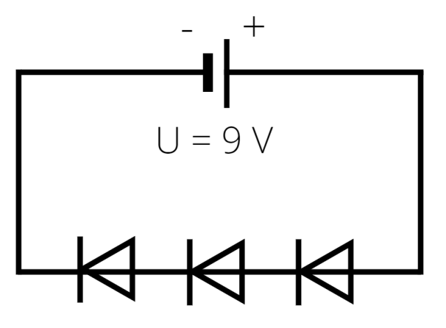 Odpowiedz, jak należy podłączyć trzy diody przystosowane do pracy pod napięciem 3 V do baterii 9 V i narysować odpowiedni schemat.