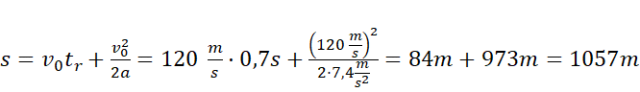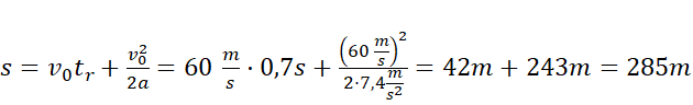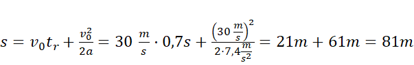 Oblicz wartość opóźnienia samochodu. Nie zależy ono od prędkości początkowej samochodu. Następnie zapisz drogę jako sumę drogi przebytej do momentu zablokowania kół (ruch jednostajny) aż do wyhamowania (ruch jednostajnie opóźniony).